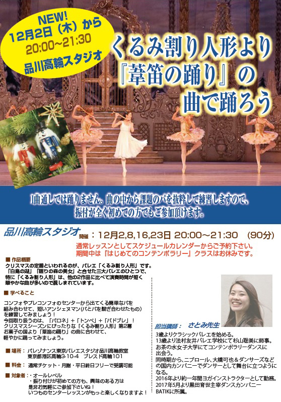 12月2日(木)から4週連続で『くるみ割り人形”葦笛の踊り”の曲を踊ろう』ワークショップをやります。