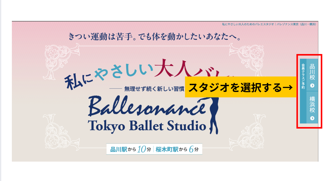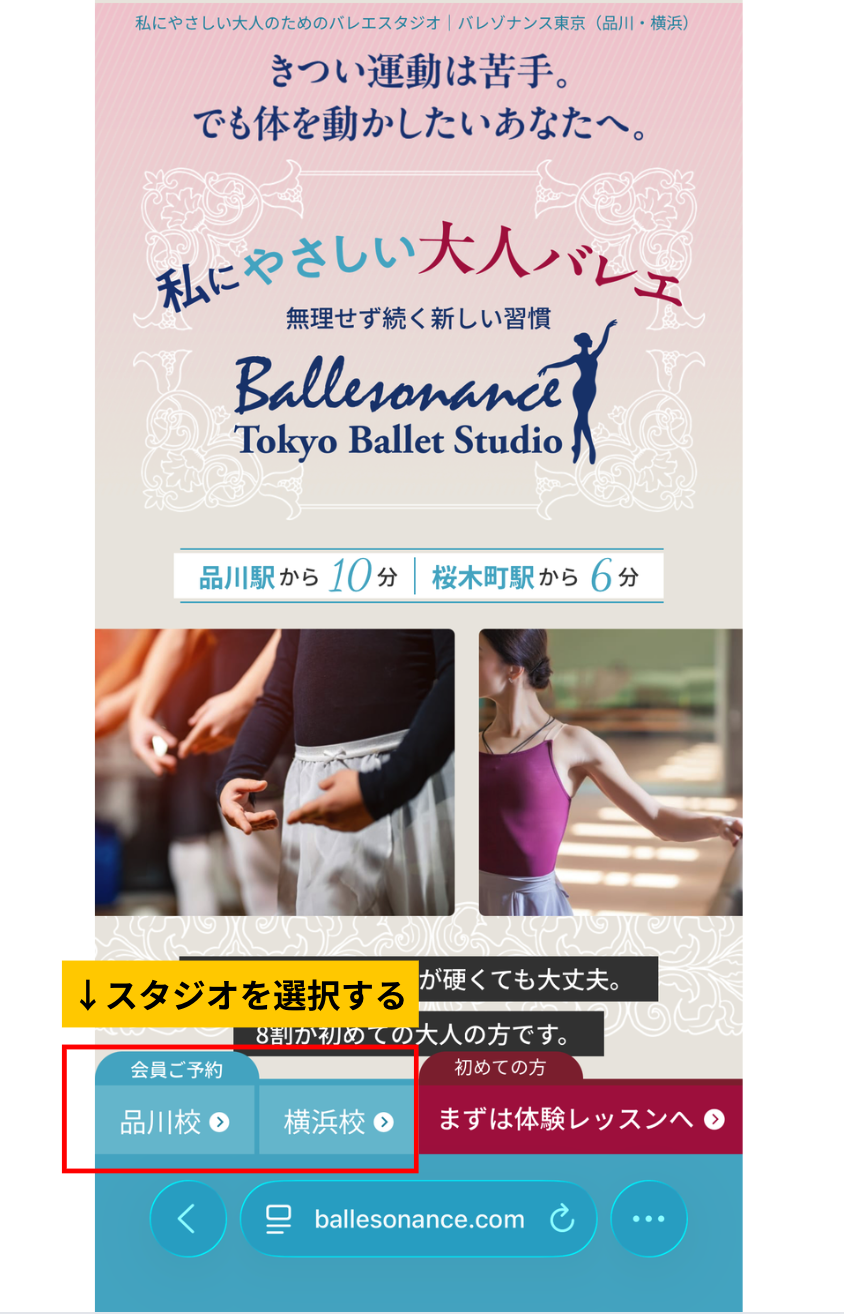 画面下部にあります「品川校」「横浜校」を選択し、ご希望のクラスをご予約ください。