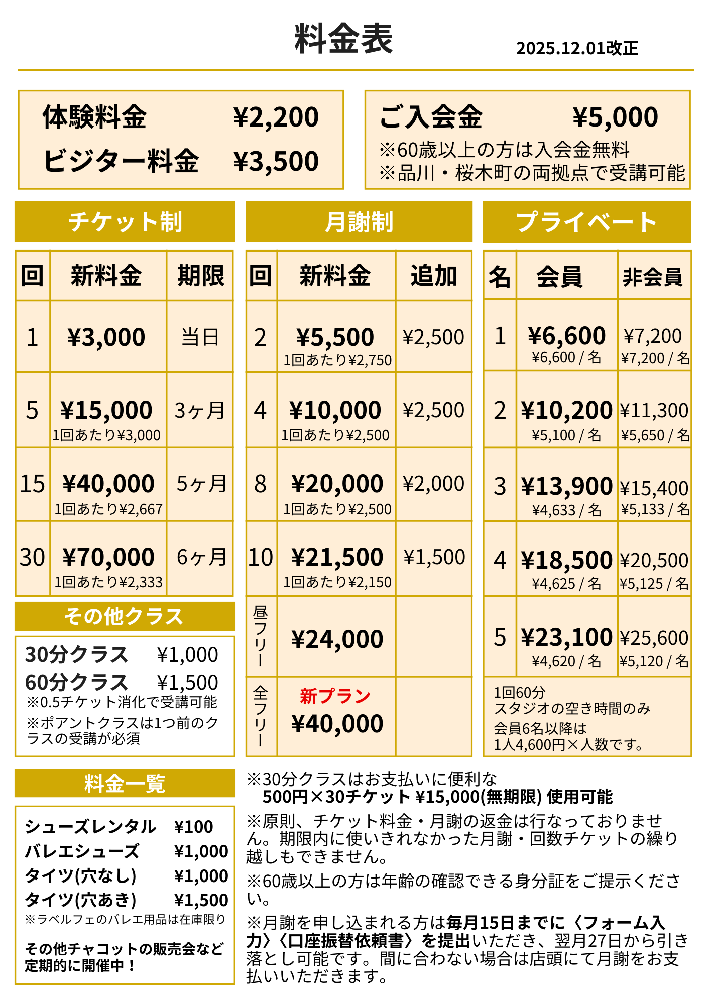 月謝・チケット料金表